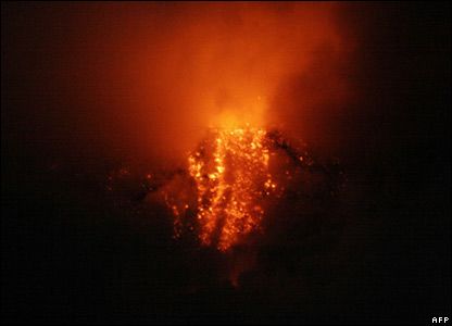 Aunque la montaña donde estaba el cráter no era visible desde la carretera de Las Manchas, el cielo sobre él se veía iluminado de un rojizo intenso por la cantidad de lava que del cráter brotaba, y el río por ella formado comenzaba a verse cuando, majestuoso, aparecía, alto en la cumbre, bordeando una montaña. Desde ahí descendía y pasaba ante nosotros hacia el mar. Era algo así como lo que se ve en esta foto, que corresponde, según BBC Mundo, al volcán Tungurahua, en Ecuador y activo desde 1999: