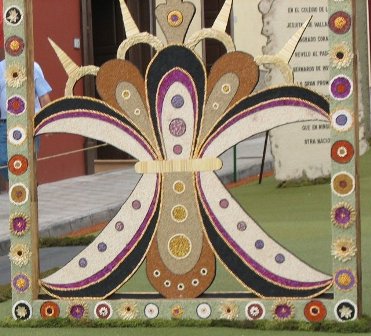 Sé que para el Paso de Abajo crea Manuel López (más conocido como Manolo Mayato), y para Fátima lo hace, desde hace años, Santiago González (en mis tiempos, Santiago el de la Central), quien no sólo concibe sino que da forma a los que hoy son sus famosos tapices —tal vez la pieza principal de estos enrames— hechos en gran parte con cáscara de huevo molida y coloreada.