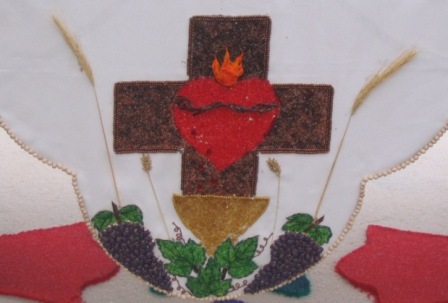 Materiales: Para el mantel usaron tela de granité. Para las uvas, guisantes. Para las hojas de parra y las espigas, cebada. Para el corazón y la cruz, cristales. Para los racimos de uvas, garbanzos.