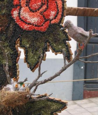 Los pájaros, motivo central del trabajo de La Rosa, fueron hechos usando estambre molido y plumas, por una señora septuagenaria y vecina de ese barrio conocida como Yaya. Según me explicaron, los creadores de la idea le dicen a Yaya qué es lo que quieren hacer, y ella se las ingenia para realizarlo.