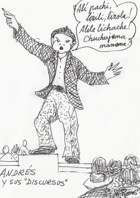 Muy pacífico y pequeño de estatura, padecía el síndrome de Down y también el de orador político, pues a poco que alguien se lo pedía ofreciéndole una peseta, se encaramaba en una pared y daba un apasionado discurso —supuestamente político, ya que Andrés suponía que eran políticos todos los discursos marcados por el tono que él imponía a los suyos— cuya duración dependía de la cuantía del dinero ofrecido, pero que siempre constaba de dos partes: cuerpo y cierre.
