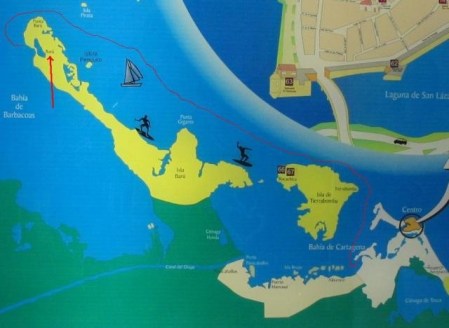 Y una vez recibido el permiso oficial, la lancha partió a full chola (toda pastilla) hacia la Isla del Encanto, un lugar netamente turístico al estilo moderno, que de isla no tiene nada, pues está donde termina la línea roja que parte desde la Bahía de Cartagena y que indica nuestro recorrido de ida. (En el de regresó entró por Bocachica, el estrecho junto al número 66).