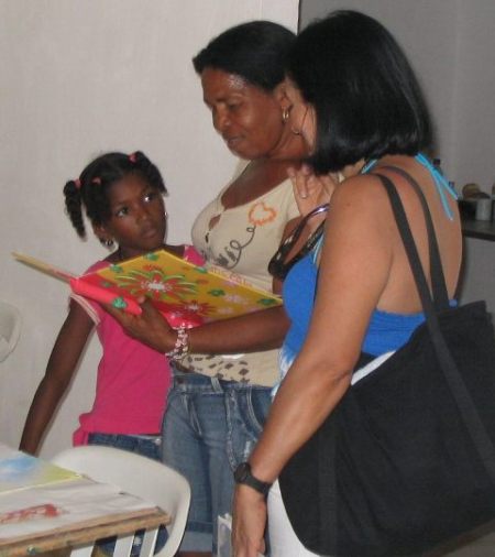 Mariela está a cargo de un taller de decoración de pareos pintados a mano sobre telas de algodón, que patrocina la llamada Fundación Aviatur