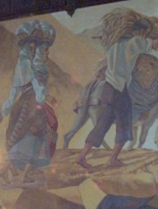 Una madre con un hijo desnudo en brazos y otro de pie junto a ella dan la nota maternal al mural. La joven mujer, que mira al espectador con grandes ojos rasgados y azules, y bajo ellos unas profundas ojeras, parece triste.
