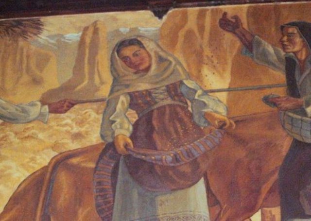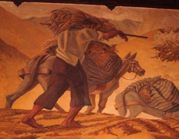 En la primera pared, la siembra del trigo “evoca la semilla como símbolo de la fecundidad”. Una yunta de bueyes tira el arado que produce en su avance hondos surcos en la aridez del terreno, mientras un labrador lanza las semillas que, lejos de caer en la tierra, lo hacen en el regazo de la linda muchacha de aspecto melancólico que surge en el centro de la escena.