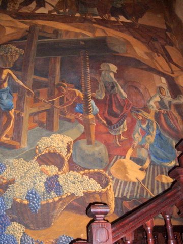 Éste se presenta como un enorme instrumento de madera que penetra hacia el fondo de la gruta. Está muy bien conseguida la interconexión entre ambas viñetas. Por un lado, el color azul añil de la falda, corpiño y forro de la montera de la campesina arrodillada y el de los dos pantalones cortos y fruncidos de los trabajadores; y, por otro, el rojo de las faldas típicas de las otras doncellas que sobresalen del fondo marrón, lúgubre y oscuro de la bodega.