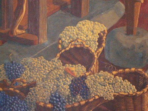 En la esquina izquierda, grandes cestas llenas de uvas blancas y negras —más bien azuladas, muy realistas—, dan un toque colorista a esta bella estancia. Ésta es la primera pintura con la que el espectador es sorprendido de frente al ascender los primeros peldaños.