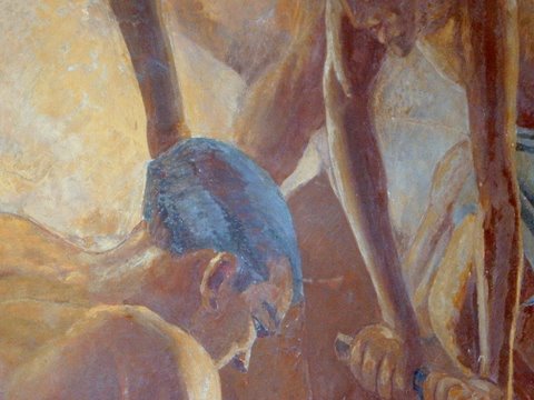En el astillero, varios hombres semidesnudos se afanan por colocar las tablas del barco en unas posturas que sugieren equilibrio y esfuerzo para no caer de los andamios.