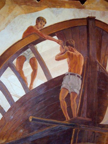 Otros cinco, con los torsos descubiertos, se hallan dentro de una barcaza ultimando los detalles de la madera. Tan sólo uno de ellos se presenta de frente al espectador con los brazos extendidos hacia arriba, mientras que los otros, cabizbajos, trabajan dentro del marco de la barca. El importante pasado naval de la capital palmera queda perpetuado en estas escenas. Es de todos conocidos que Santa Cruz de La Palma se erigió como el tercer puerto más importante del Imperio de Carlos V, tras Amberes y Sevilla. Su astillero aportó mucha riqueza y gloria a la historia de la Isla.