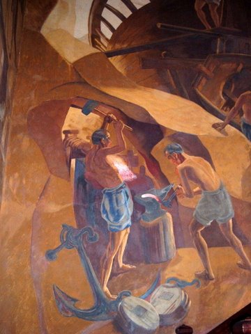 Al lado, en la fragua, varios obreros se afanan por dar forma a los utensilios y aparejos del barco. Un ancla reparada y unas poleas yacen junto al yunque. El rojo del fuego del horno y del hierro candente, sostenido fuertemente por uno de ellos para que el otro lo moldee con un gran martillo, se refleja en los rostros de los dos herreros. Es una pincelada de color sobre un monótono fondo de marrones y grises. Alguien ha querido ver en la escena cómo la chispa de vida y la alegría surge incluso de las profundidades de un mundo pesaroso plagado de dificultades.