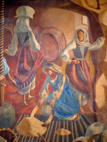 En la primera pared, la siembra del trigo “evoca la semilla como símbolo de la fecundidad”. Una yunta de bueyes tira el arado que produce en su avance hondos surcos en la aridez del terreno, mientras un labrador lanza las semillas que, lejos de caer en la tierra, lo hacen en el regazo de la linda muchacha de aspecto melancólico que surge en el centro de la escena.