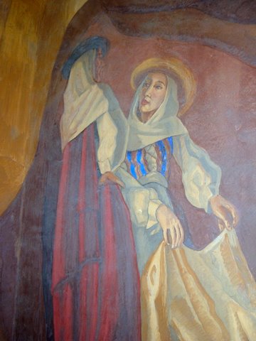Una madre con un hijo desnudo en brazos y otro de pie junto a ella dan la nota maternal al mural. La joven mujer, que mira al espectador con grandes ojos rasgados y azules, y bajo ellos unas profundas ojeras, parece triste.