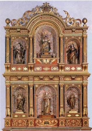 La talla que actualmente preside el retablo, es la más antigua de ellas, y no pertenece al mismo envío. Se trata de la magnífica escultura de origen andaluz de Nuestra Señora de Montserrat, importada por el catalán don Gabriel de Socarrás, en el primer tercio del siglo XVI. Ocupaba el retablo de su capilla, hoy del Cristo de La Piedra Fría.