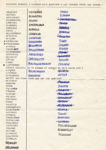 Lista de nombres sugeridos para mis patos. Los tachados o con asterisco fueron asignados.