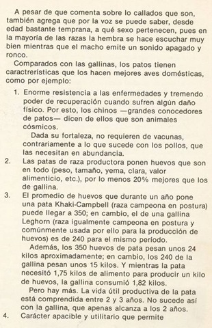 Por estos manuales supe acerca de las características de los huevos de pato y de sus ventajas sobre los de gallina, en especial si éstos eran comprados en un mercado o a los buhoneros que solían venderlos en Caracas en la calle, a veces a pleno sol, y sin refrigeración alguna.