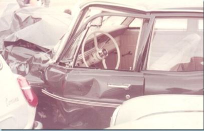 Nótese que el volante está doblado hacia afuera por el impacto con mi pecho. La protuberancia que se ve en la puerta la hizo mi codo izquierdo, y el hundimiento en el techo causó una herida en lo alto de mi cabeza.
