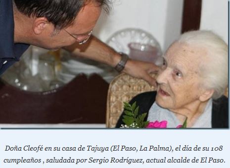 Doña Cleofé en su casa de Tajuya (El Paso, La Palma), el día de su 108 cumpleaños , saludada por Sergio Rodríguez, actual alcalde de El Paso.