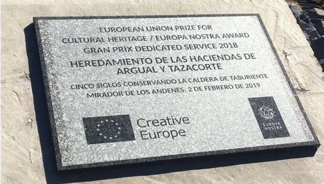 Este sábado, 02/02/2019, ha tenido lugar en el Mirador de Los Andenes, en el Roque de Los Muchachos, la colocación de la placa nominativa al Heredamiento que acredita la obtención del Premio Europa Nostra 2018.