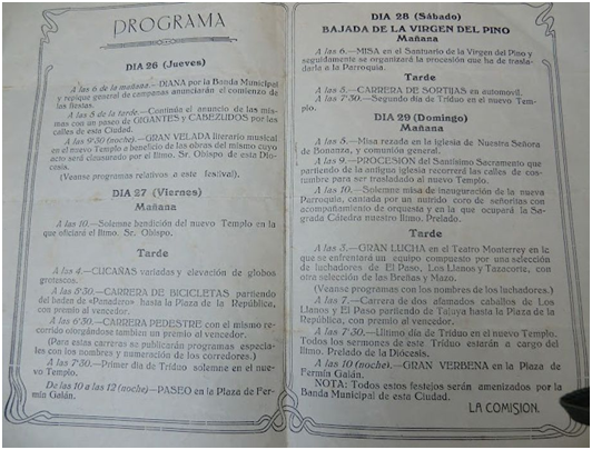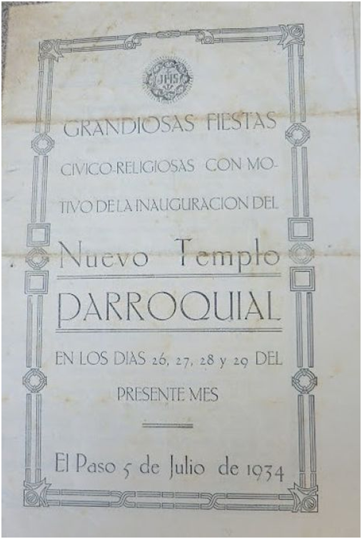 Así, se anunciaron a través de notas en prensa y programas de mano editados para la ocasión: Grandes fiestas Cívico Religiosas con motivo de la inauguración del nuevo templo parroquial de la ciudad de El Paso, que habrían de celebrarse los días 26, 27, 28 y 29 de julio de 1934.