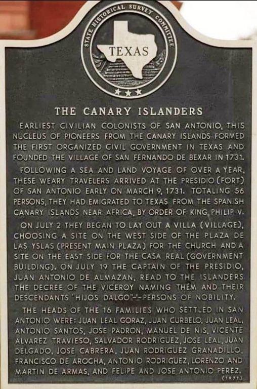 Primeros colonizadores civiles de San Antonio, un grupo de pioneros de las Islas Canarias que crearon el primer gobierno civil en Texas, y en 1731 fundaron la villa de San Fernando de Bexar.