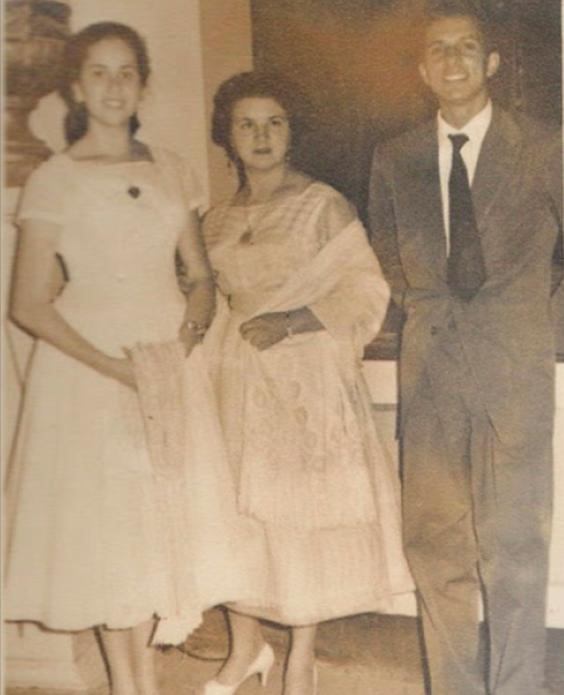 De izquierda a derecha: 1. Luz María Padrón Pérez (Prima mía por partida doble: prima tercera porque compartimos tatarabuelos, y prima segunda porque compartimos bisabluelos. Según he sabido ahora, después de 60 años, sus admiradores de Los Llanos la llamaban «La chica del nisperero» porque no sabían su nombre y en el patio delantero de la casa donde ella vivía había entonces un nisperero grande y frondoso); 2. Lourdes Guélmez Pérez; 3. Manuel Jesús Pino Mederos (Manolo Mederos)