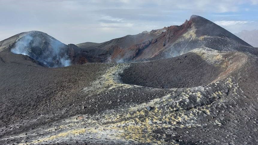 Cráteres de la zona sureste del volcán de Cumbre Vieja, el pasado 9 de enero, con desgasificación y depósitos de azufre. RUBÉN LÓPEZ/IGN