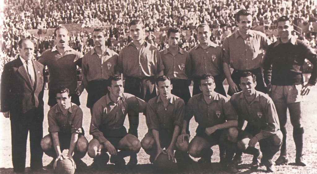 Real Murcia. Temporada 1953-54. Formación en el Estadio Insular de Las Palmas, el 21 de marzo de 1954. Partido correspondiente al Campeonato de Liga de Segunda División. El equipo murciano con anterioridad había visitado la Isla de La Palma y se enfrentó en un partido amistoso al Atlético Paso.