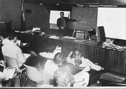 Alberto Castillo Vicci explica qué es la computación y qué es la Empresa Regional de Computación a sus potenciales usuarios en diciembre de 1970, en el recién inaugurado edificio del Consejo Municipal de Barquisimeto (colección de A. Castillo Vicci)