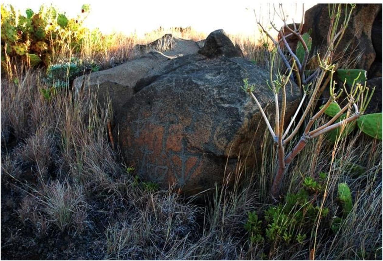En el cantón de Tedote existe una interesante zona en la que, nuevamente, el mundo aborigen y la época histórica parecen claramente interrelacionados. Nos referimos al conjunto arqueológico situado en las inmediaciones del Lomo Boyero (La Grama. Breña Alta), en el que destacan unos grabados rupestres cuya adscripción prehispánica, desde su hallazgo, ha provocado controversia. Sus petroglifos cruciformes se han interpretado, entre otras teorías, como que “…sirvieran para cristianizar antiguos lugares de brujería…” (M. Hernández Pérez, 1977: 53). En este sentido, hemos de reseñar que se sitúan sobre el mismo borde superior de la margen izquierda del Barranco del Cuervo, cuyas cavidades naturales solo fueron utilizadas por la población benahoarita como lugar de enterramiento de sus seres queridos.