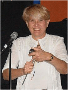 Aquí, en foto más reciente (2006), se la ve tras un micrófono, que es donde le gustar estar,… si es para cantar, lo cual hace muy bien porque tiene, además de pasión por la música, una estupenda voz y, sobre todo, un excepcional oído musical.