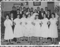 Misma fecha de la foto anterior y mismos varones excepto por don Salvador Miralles, al fondo a la izq., párroco del pueblo. Las damas, de atrás hacia adelante y de izq. a derecha: Teresa Calero, Carmen María Capote, Marisol ¿?, Celina Pino, ¿?, ¿?, Gloria Isabel Rodríguez, Pepita Taño, Rosa Castro, y Teresa García.