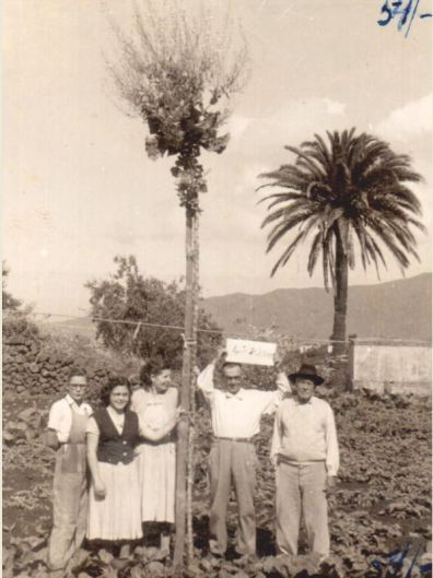 Fiesta de El Pino, primer domingo de septiembre de 1955. Mi prima Celina Pérez Padrón (delante, a la izq.) y yo (al fondo, izq.) acompañamos a los hermanos Silva Padrón, nuestros primos de San Pedro (Breña Alta), cuatro hermanas y un varón, Paco, que está a mi izquierda.